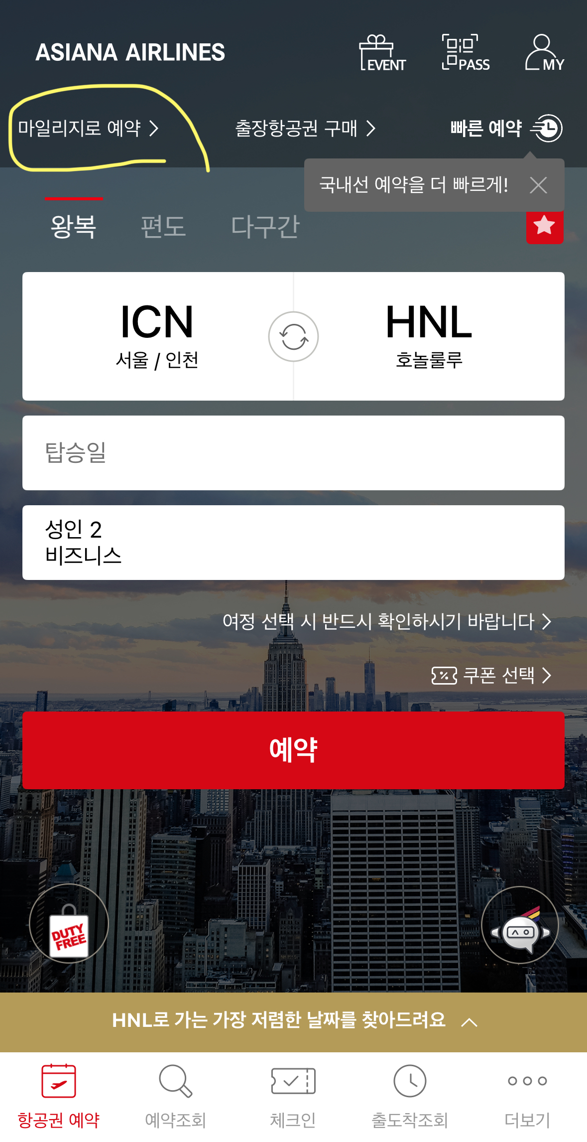 모바일 앱으로 간편하게! '마일리지로 예약' 클릭!
