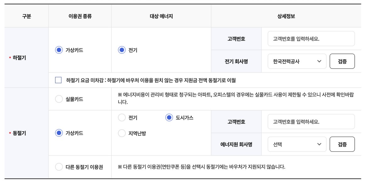 - 하절기 바우처 동절기 이월: 앞서 말씀드렸듯, 여름에 사용하고 남은 바우처는 겨울로 이월됩니다. 하지만 이월을 원한다면 신청 시 '하절기 요금 미차감'을 꼭 체크해야 해요! 이걸 놓치면 남은 금액이 자동으로 소멸될 수 있으니 주의하세요!